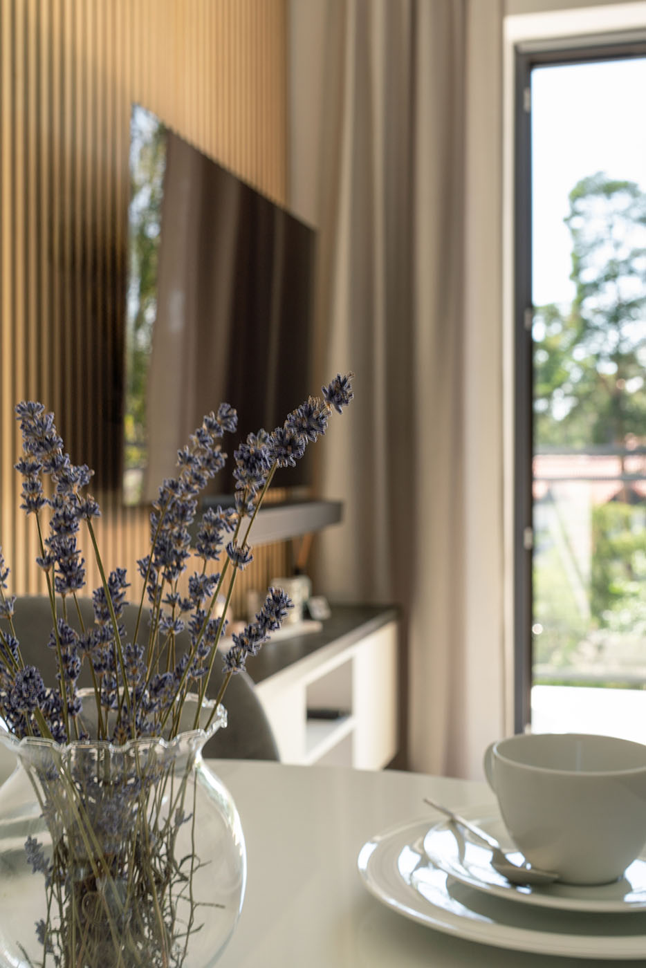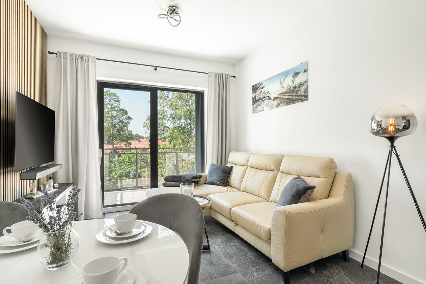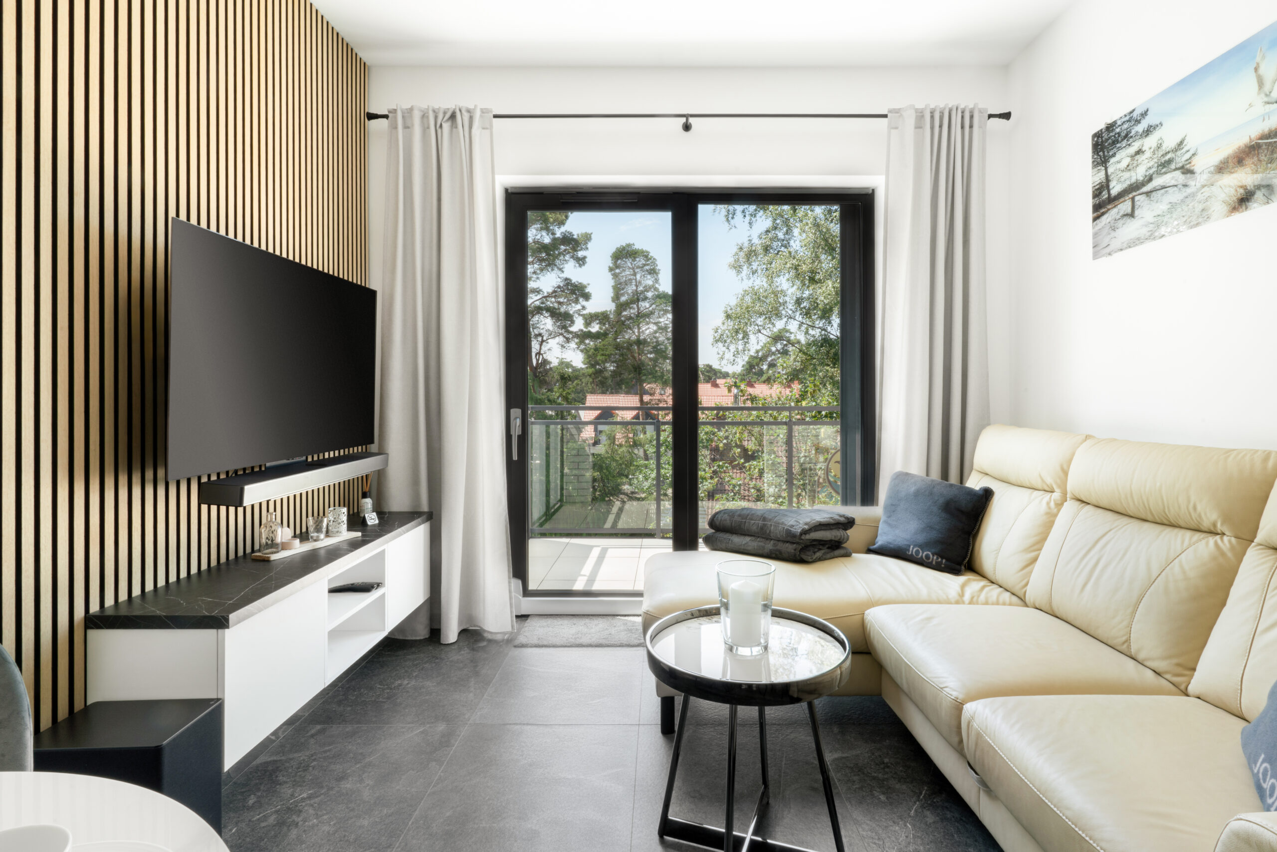 Wideo uzupełniło sesję zdjęciową, ukazując atmosferę apartamentu – od porannego światła wpadającego przez duże przeszklenia, po spokojne wieczory z widokiem na korony drzew. W tle – cichy szum mew i delikatna bliskość natury, która odcina od zgiełku kurortu.
